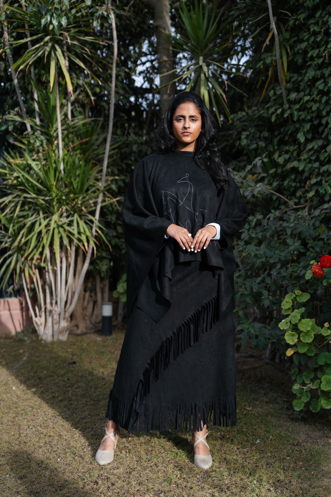 Suede skirt with dynamic fringe details, designed to move effortless with every step.