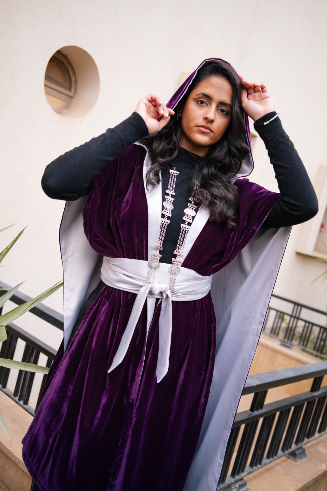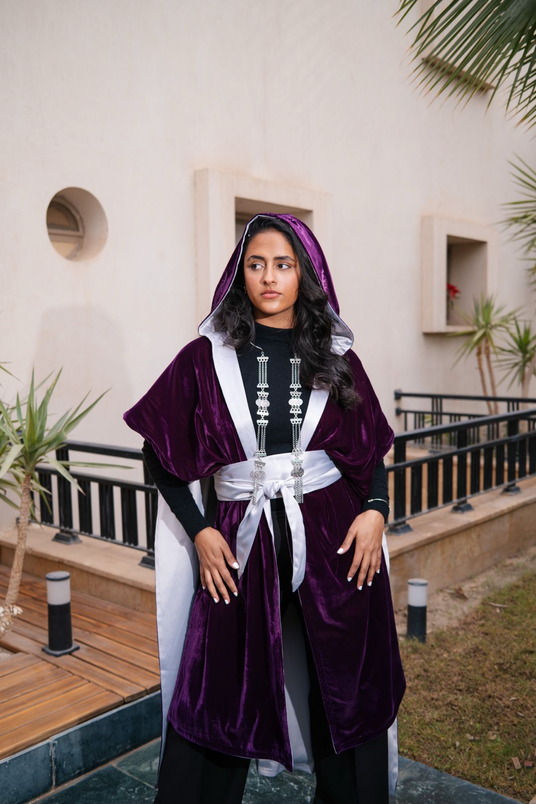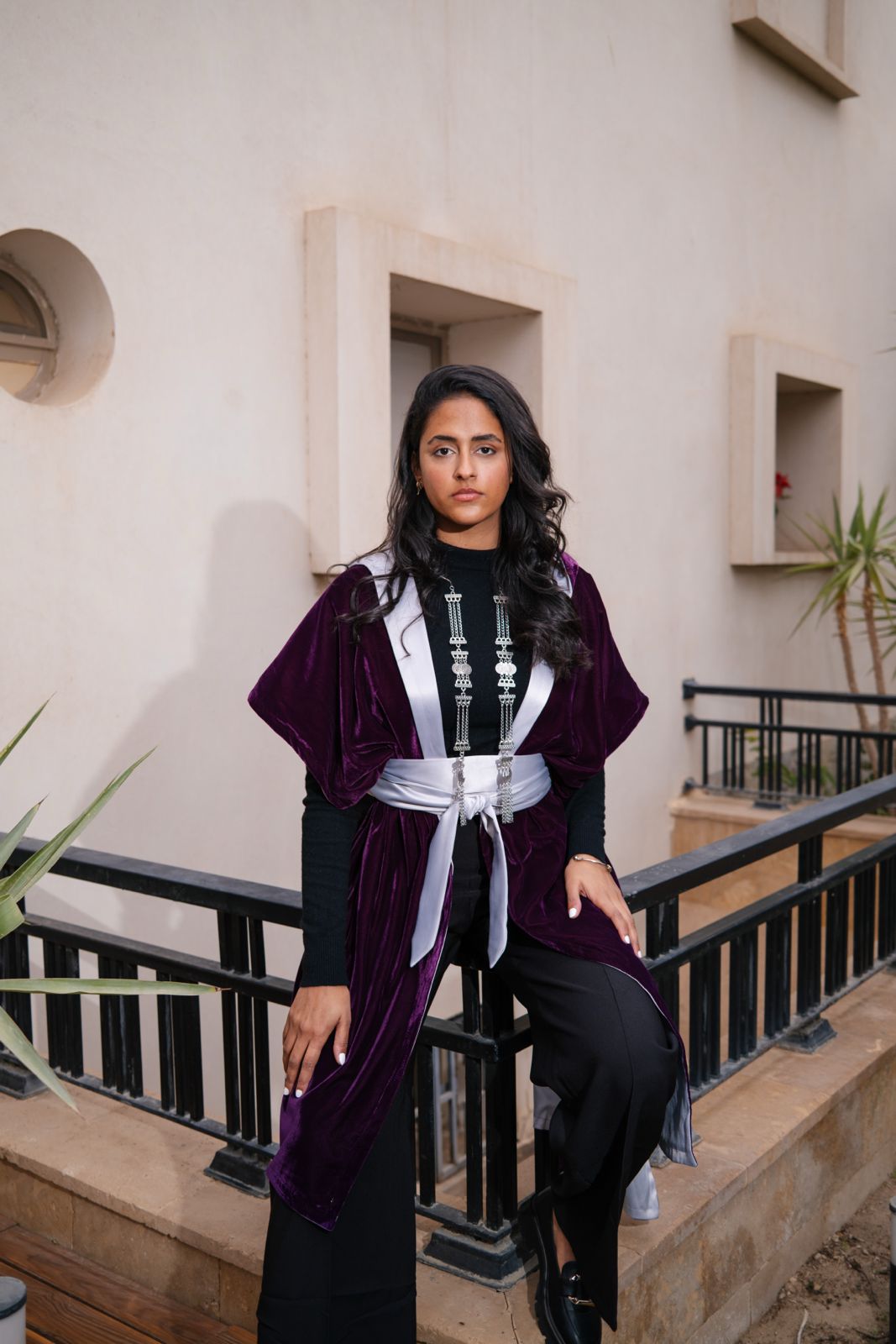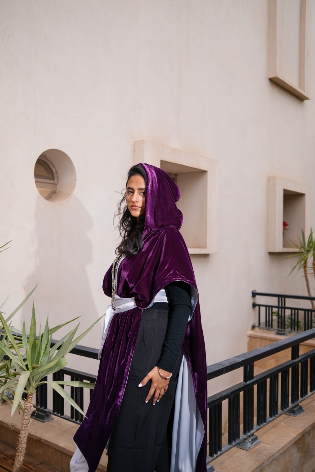 A pure silk velvet poncho with a relaxed silhouette, designed for effortless elegance.