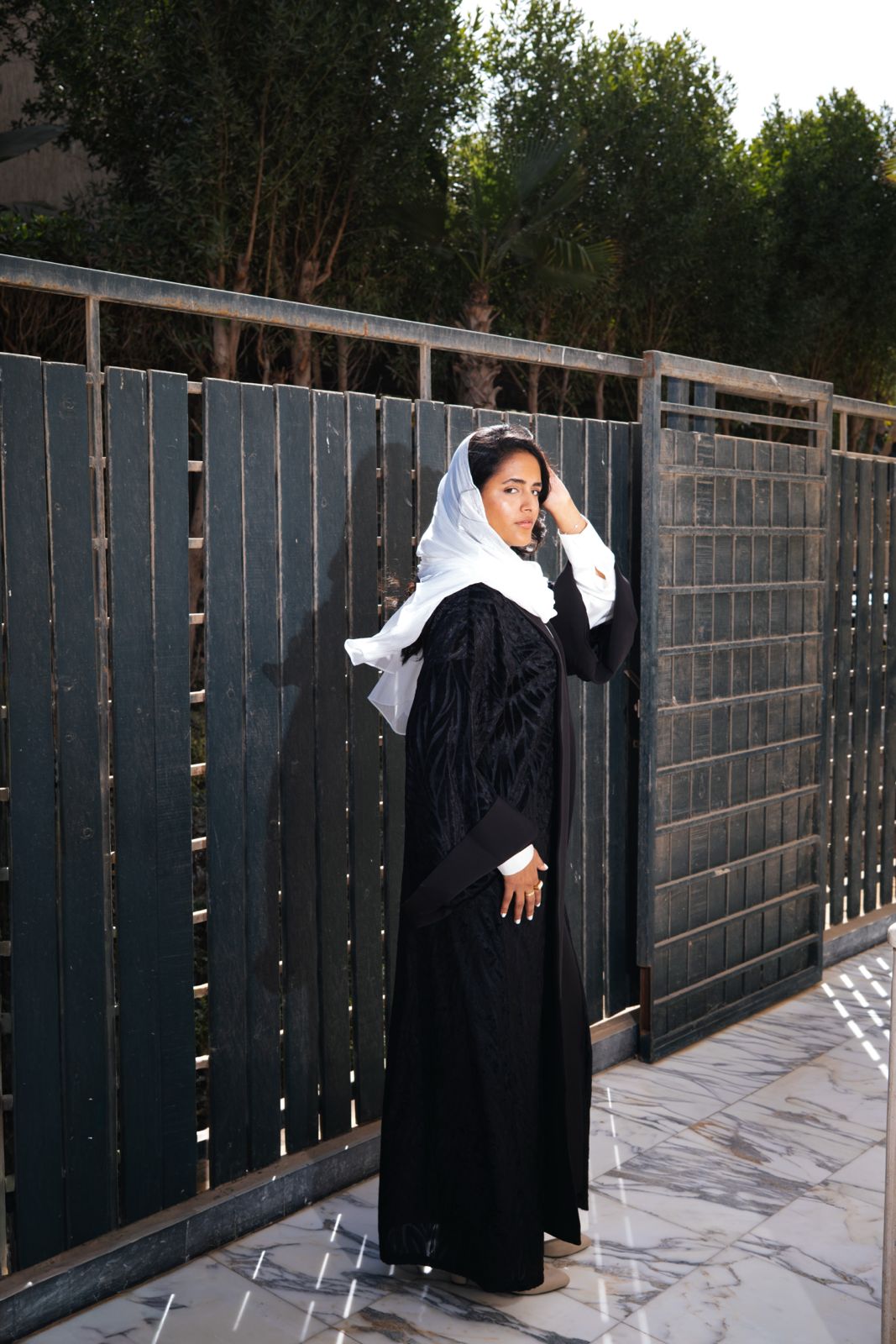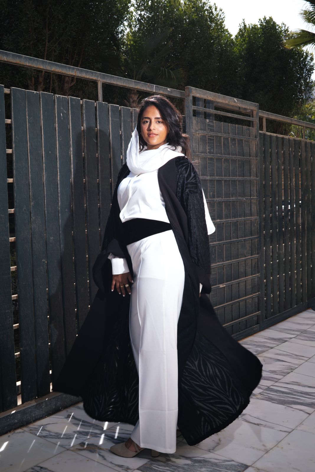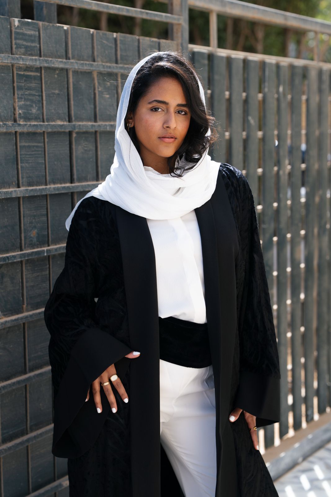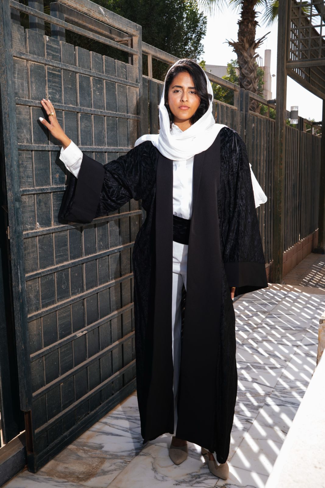 The Skoon Kaftan, crafted from luxurious velvet and heavy crepe,Refined kaftan with elegant textured detailing, designed to be worn open or closed for effortless elegance.