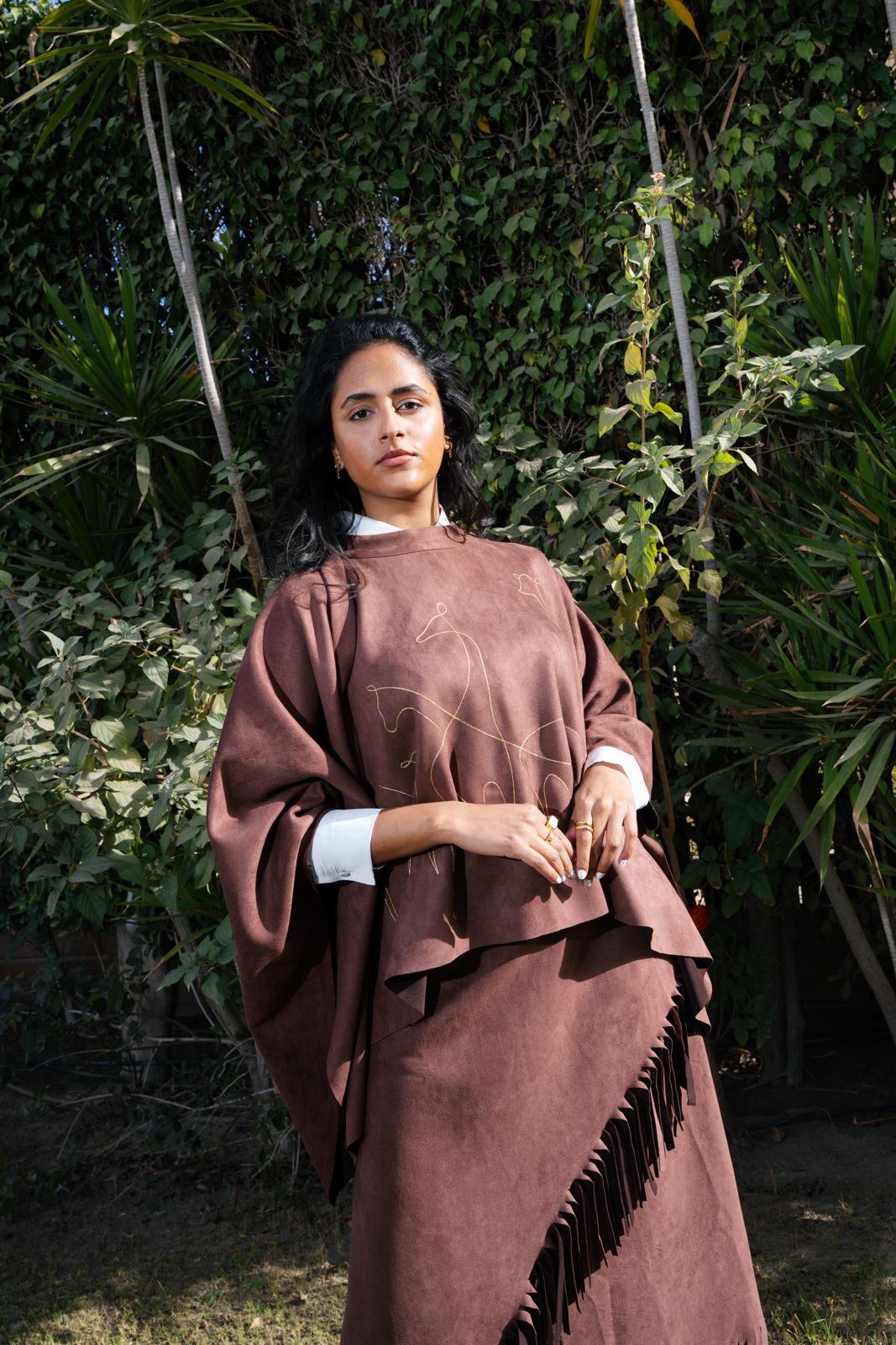 Soft Suede poncho featuring LonganZy’s signature embroidery and an elegant relaxed drape.