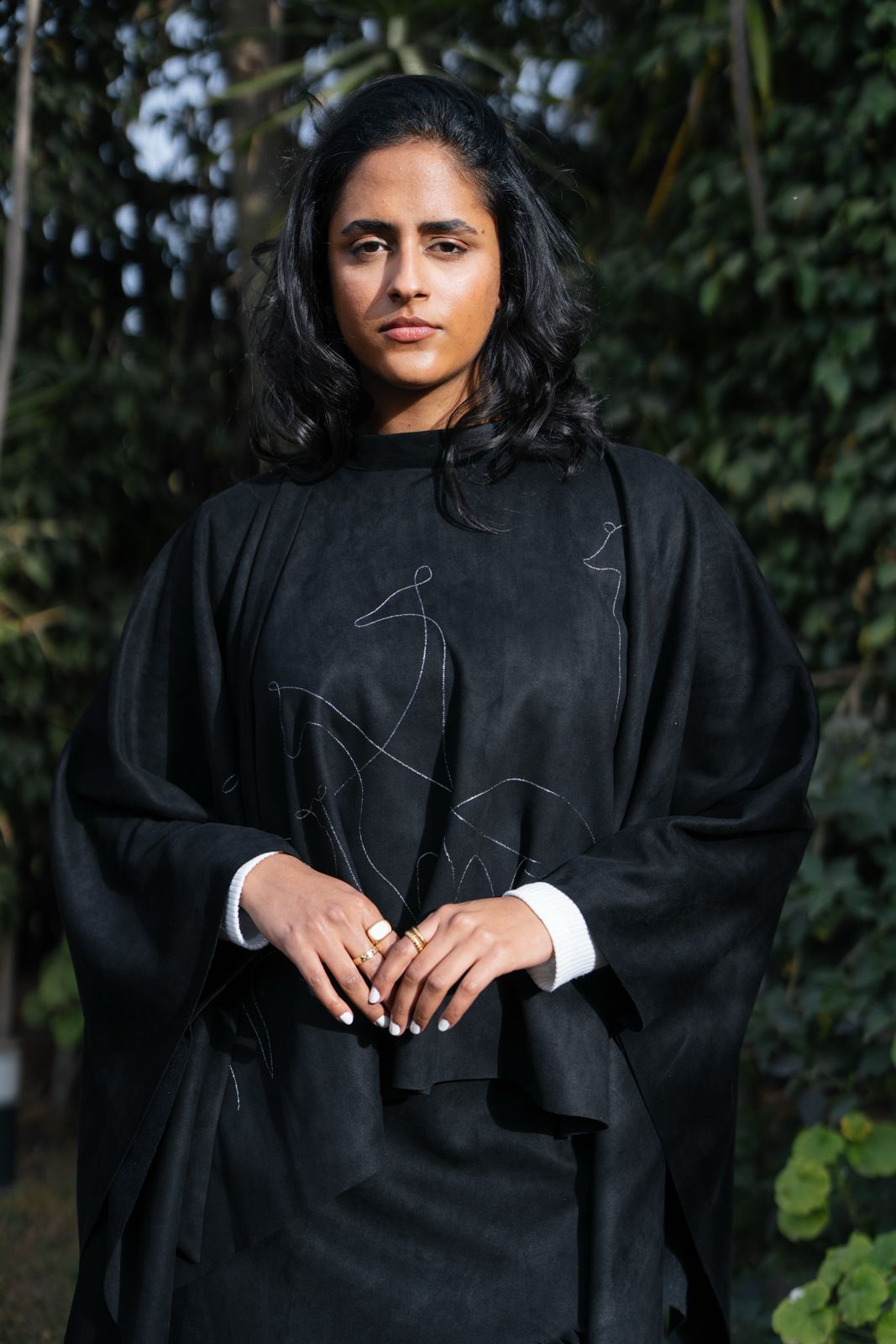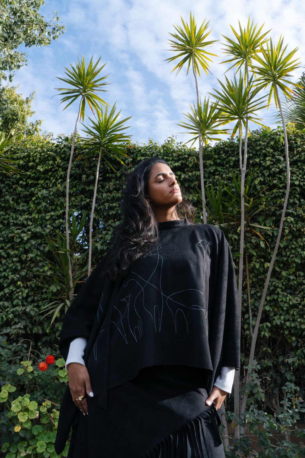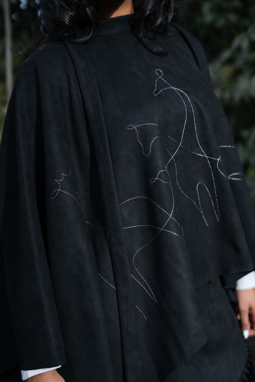 Soft Suede poncho featuring LonganZy’s signature embroidery and an elegant relaxed drape.